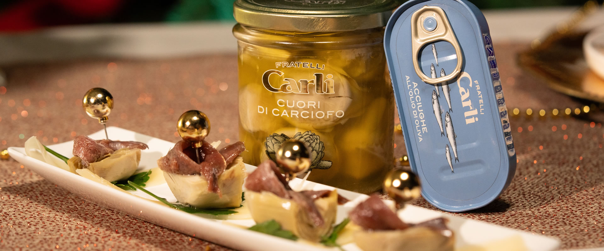 Gli stessi finger food natalizi sono perfetti. Via libera a crostini con il nostro Patè di Olive, mini quiche con i nostri Cuori di Carciofo e insalata di farro o orzo arricchito con Tonno e verdure sott'olio.