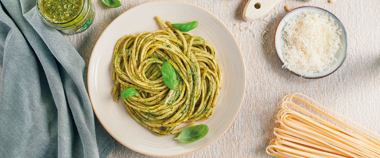Olio extra vergine di oliva, basilico Genovese D.O.P. 13%, pinoli 8%, proteine del latte, formaggio 4%, panna, sale, Parmigiano Reggiano D.O.P. 0,5%, Pecorino Romano D.O.P. 0,5%, aglio 0,4%, aromi naturali, correttore di acidità: acido lattico, acido citrico, antiossidante: acido ascorbico. Contiene latte. Può contenere tracce di frutta a guscio e arachidi.