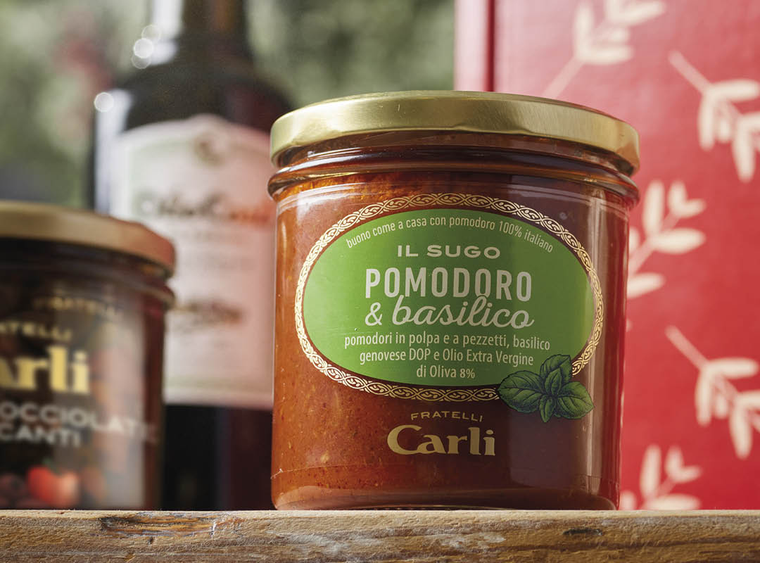 Polpa di pomodoro 69%, doppio concentrato di pomodoro, olio extra vergine di oliva 8%, cipolla, Basilico Genovese D.O.P. 4%, sale, zucchero, aglio. Correttore di acidità: acido citrico. Antiossidante: acido ascorbico.