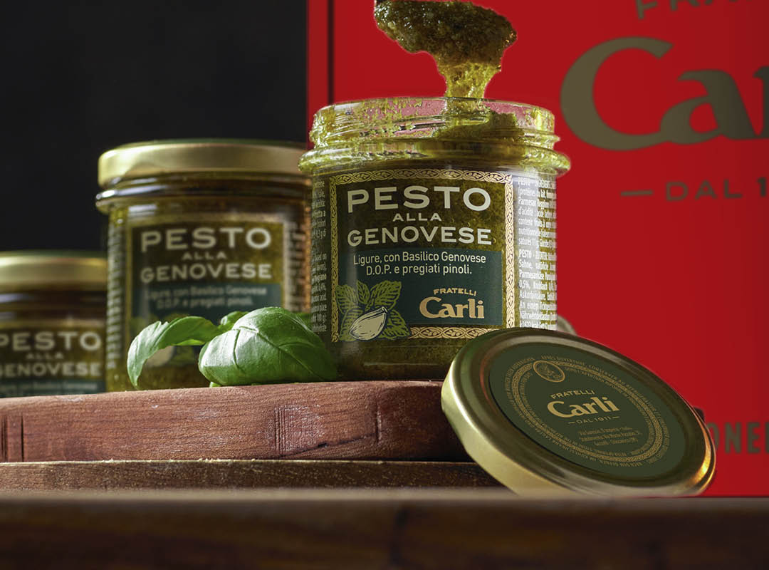 Olio extra vergine di oliva, basilico Genovese D.O.P. 13%, pinoli 8%, proteine del latte, formaggio 4%, panna, sale, Parmigiano Reggiano D.O.P. 0,5%, Pecorino Romano D.O.P. 0,5%, aglio 0,4%, aromi naturali, correttore di acidità: acido lattico, acido citrico, antiossidante: acido ascorbico. Contiene latte. Può contenere tracce di frutta a guscio e arachidi.