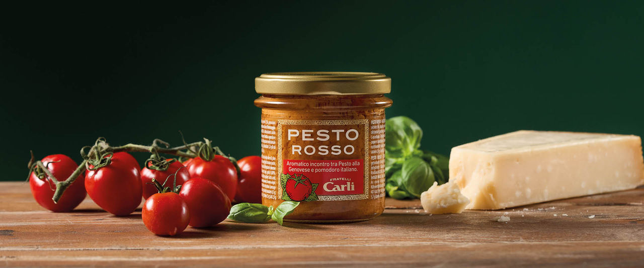 Polpa di pomodoro 37%, olio extra vergine di oliva, pinoli 7,5%, pomodori essiccati, pomodoro doppio concentrato, Basilico Genovese D.O.P. 5%, sale, zucchero, proteine del latte, formaggio 0,2% (latte), panna (latte), aglio 0,08%. Antiossidante: acido ascorbico. Correttore di acidità: acido lattico. Può contenere tracce di altra frutta a guscio e arachidi.