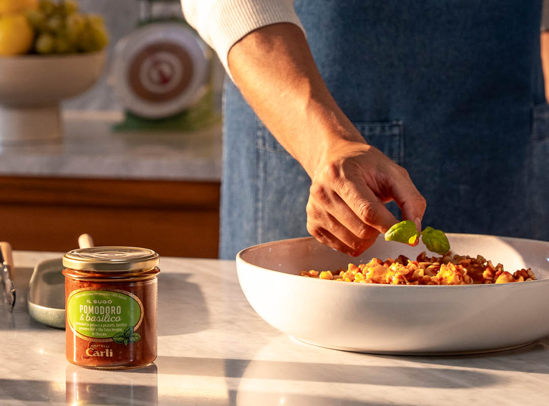 Polpa di pomodoro 69%, doppio concentrato di pomodoro, olio extra vergine di oliva 8%, cipolla, Basilico Genovese D.O.P. 4%, sale, zucchero, aglio. Correttore di acidità: acido citrico. Antiossidante: acido ascorbico.